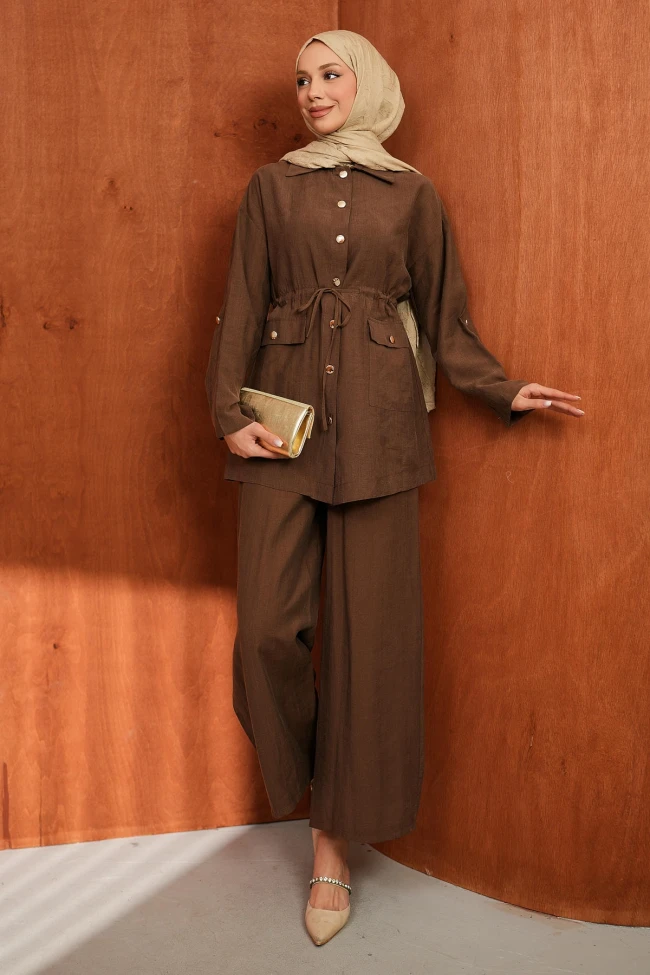 * Ürün Detay : Tunik-pantolon takımı, hem konforu hem de çabasız şıklığı bir araya getiren oldukça dengeli bir parça.Belden büzgülü ipli tasarımı, oversize görünümü kırmadan vücut hatlarını zarifçe belli ediyor. Gömlek yaka ve ön boydan düğme detayı, takıma hem günlük hem de şık bir hava katmış.Geniş paça kesimi, gün boyu hareket özgürlüğü sağlarken aynı zamanda modern bir silüet oluşturuyor.