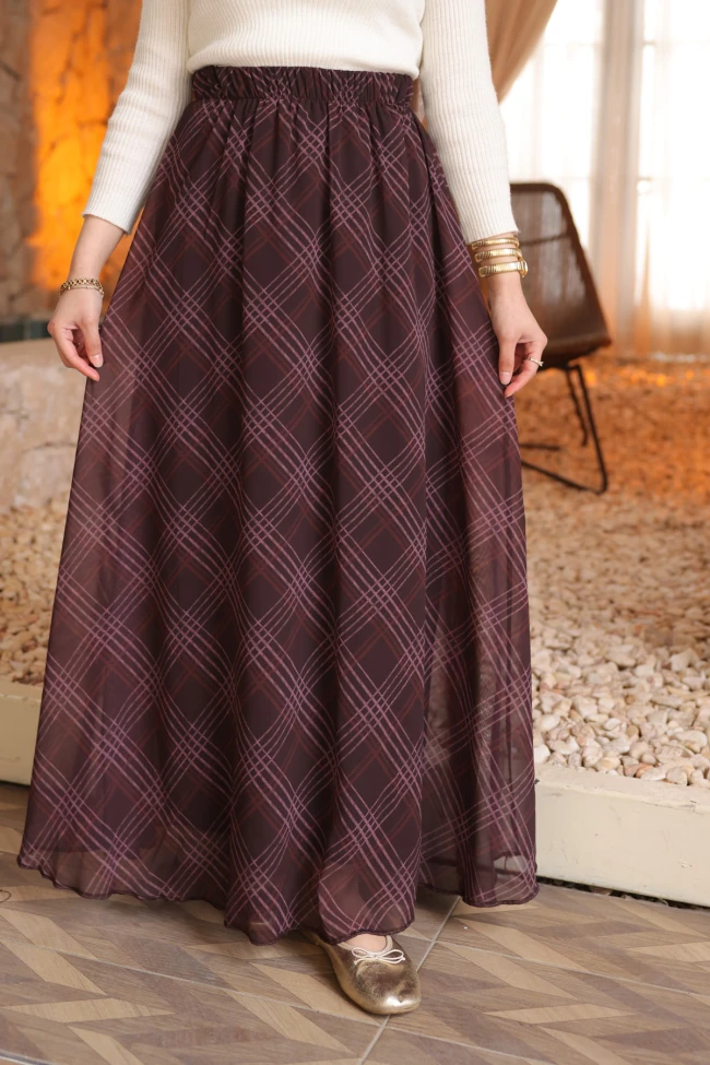 Mürdüm Bel Lastikli Astarlı Şifon Etek Haki Bel Lastikli Astarlı Şifon Etek