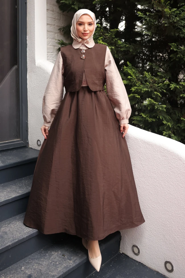 * Ürün Detay : Geleneksel tesettür giyimini modern ve katmanlı bir tasarımla sunuyor.Elbisenin göğüs kısmındaki büyük düğmeler odak noktasını yukarı çekerek şık bir detay katıyor.Belden itibaren genişleyen etek formu, zarif bir döküm sergiliyor ve gün boyu konforlu bir kullanım vaat ediyor.