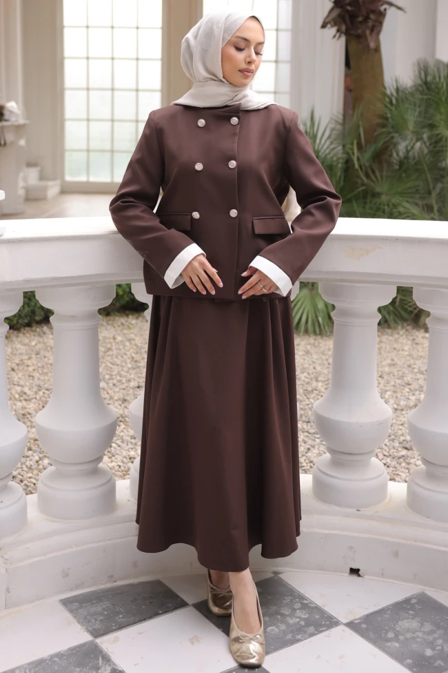 * Ürün Detay : Takım, bir öncekine göre daha maskülen ve yapısal bir şıklığa sahip. Özellikle kruvaze kesim ve manşet detayları tasarımı oldukça karakteristik kılıyor.Çift sıra düğmeli kruvaze kesim, takıma daha şık bir hava katmış. Dik yaka detayı ise bu "modern vintage" görünümünü destekliyor.Ceketin kollarındaki açık renk manşetler, kumaşla harika bir zıtlık oluşturarak kombine aydınlık bir hava katmış.Ceketteki kapaklı cepler, tasarıma boyut katarak daha yapısal bir duruş sağlamış.Etek, ceketin daha sert ve köşeli hatlarını yumuşatacak şekilde akışkan ve sade tutulmuş.Ceket astarlıdır.Etek bel lastikli ve yan fermuarlıdır.