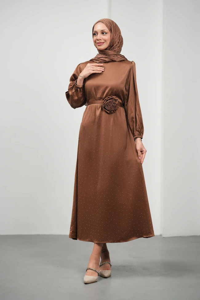 * Ürün Detay :Bel kısmındaki büyük gül detayı, elbisenin odak noktası. Bu tarz floral eklentiler sezonun trendleri arasında yer alıyor ve sade kesime hareket katıyor.Hafif balon kol detayı, muhafazakar moda standartlarına tam uyum sağlarken modern bir silüet çiziyor. Abiyemiz, hem zarafeti hem de modern detayları bir araya getiren oldukça şık bir tasarım.Kumaş üzerindeki ışıltı detayı, elbiseye gece davetleri için uygun, ışıltılı bir hava katmış.Kol manşetleri lastiklidir.Sırt fermuarlıdır.