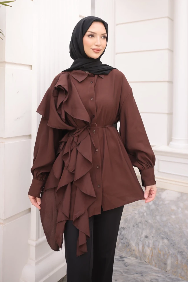 * Ürün Detay : Tunik, hem modern hem de oldukça iddialı bir tasarıma sahip.Tunikteki en dikkat çekici unsur, omuzdan aşağıya doğru asimetrik bir şekilde inen katlı volanlar.Beldeki ince kuşak, dökümlü kumaşı toparlayarak vücut hatlarını daha dengeli göstermiş.Manşetli ve hafif balon kol yapısı, tuniğin feminen ve romantik havasını destekliyor.