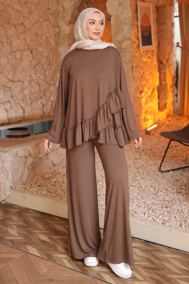 * Ürün Detay : İkili takım, hem konforu hem de feminen detayları bir araya getiren, günlük şıklık için ideal bir tasarım.Takımın en belirgin özelliği, üst parçada asimetrik bir hat boyunca ilerleyen ve etek ucunda devam eden kat kat fırfırlar. Bu detay, düz ve salaş bir kesime hareket ve romantik bir hava katmış.Üst parça, omuzlardan aşağıya doğru genişleyen çan bir kesime sahip. Bu form, vücut hatlarını belli etmeden zarif bir silüet oluşturuyor.Alt parça, üstün salaşlığıyla uyumlu, dökümlü ve geniş paçalı bir pantolon olarak tasarlanmış. Bu ikili, bütünsel bir akışkanlık sağlıyor.Pantolon yüksek bel bel lastikli cepli.