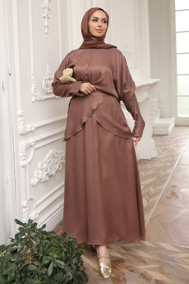 * Ürün Detay :Saten kumaşın karakteristik parlaklığı, ürünümüzde çok dengeli yakalanmış. Kumaşın akışkanlığı, hem etek hem de üst parçada kendini net bir şekilde gösteriyor.Tuniğin ön kısmındaki asimetrik kesim, düz bir saten takımı çok daha hareketli ve tasarım odaklı bir seviyeye taşımış. Yarasa kol detayları ise tesettür giyimde aranan konforu ve modernliği sağlıyor.Eteğin hafif çan kesimi, saten kumaşın vücuda yapışmasını engelleyerek müşterinin en çok dikkat ettiği "kullanım rahatlığı" mesajını veriyor.Etek bel lastikli ve ceplidir.