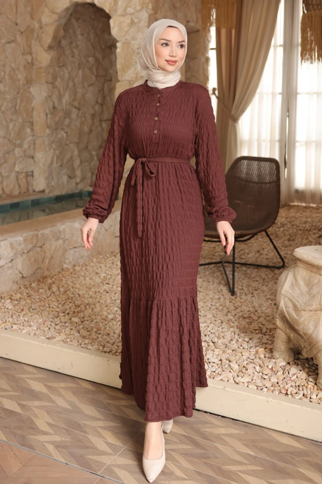 * Ürün Detay : Elbise, hem dokusu hem de kesimiyle oldukça şık ve modern bir tesettür giyim örneği sunuyor.Elbisenin en dikkat çekici özelliği, kumaşın kendinden kabartmalı bürümcük dokusu.Göğüs kısmındaki yarım patlı düğme detayları, elbiseye hafif bir spor-şık hava katmış.Kendi kumaşından olan kuşak, bel hattını belirginleştirerek daha feminen bir silüet oluşturuyor.Etek ucundaki hafif volan detayı, elbiseye hareket ve romantik bir hava katmış.