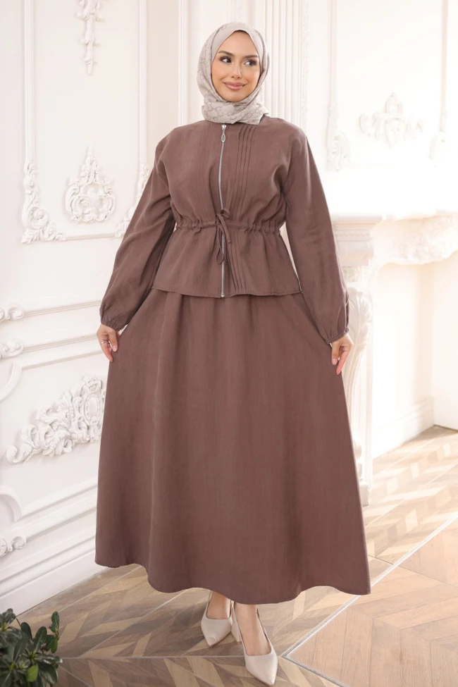 * Ürün Detay : Takımı, modern muhafazakar moda çizgilerini fonksiyonel detaylarla birleştiren şık bir takım.Boydan fermuarlı olması kullanım kolaylığı sağlarken, beldeki büzgü detayı vücut hatlarını belli etmeden form kazandırıyor. Göğüs kısmındaki pileli dokunuşlar ürüne hareket katarak sıradanlıktan uzaklaştırmış.Geniş kesim etek, hem konforlu bir hareket alanı sunuyor hem de tesettür giyim standartlarına tam uyum sağlıyor.Lastikli manşetler, balon kol havası vererek modern bir görünüm sunuyor.