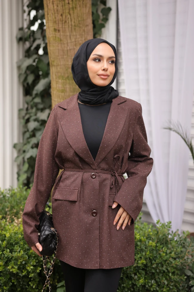 * Ürün Detay : Ceket, hem kumaş dokusu hem de tasarım detaylarıyla oldukça modern ve şık bir çizgiye sahip.Kumaş üzerine işlenen küçük taş detayları, düz bir ceketi anında "gece şıklığına" veya özel gün kullanımına uygun hale getirmiş.İnce kendi kumaşından kemer kullanımı, ceketin oversize duruşunu kırarak beli vurguluyor ve daha kadınsı bir silüet oluşturuyor.Geniş kapaklı cepler ve ton-sür-ton düğmeler, cekete maskülen bir blazer havası katsa da, taş detayları bu havayı yumuşatıyor. Cepler sahte ceptir.Astarlıdır.