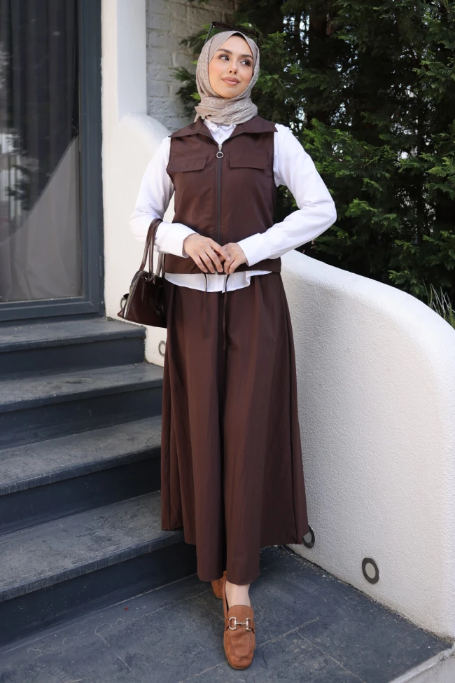 * Ürün Detay : Hem modern hem de modest giyim tarzını bir araya getiren oldukça dengeli ve şık bir kombin.Fermuarlı ve cepli yapısı takıma sportif bir hava katmış. Bel kısmındaki ayarlanabilir bağcık detayı, yeleğin formunu kişiselleştirmeye olanak tanıyor.Geniş kesimli ve dökümlü yapısı, hem konforu hem de şıklığı bir arada sunuyor. Kumaşın hafif dokulu olması, ütü derdini azaltan pratik bir tercih.Klasik beyaz gömlek, yeleğin altından hafifçe görünerek katmanlı bir görünüm oluşturmuş. Bu, stil sahibi bir derinlik katıyor. Etek ceplidir.