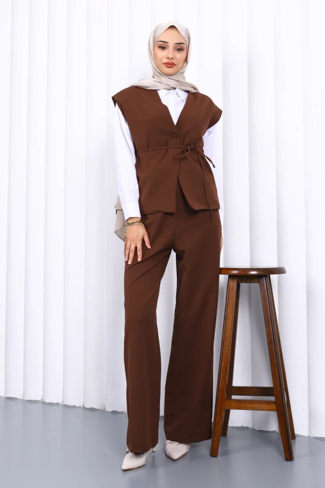 * Ürün Detay : Ürünümüz Dabıl Krep kumaştan üretilmiştir. Yelek ile Pantolon ikili takım şeklindedir. Yelek ön kısmı düğmeli ve kuşaklıdır. Pantolon bel kısmı düğmelidir.
