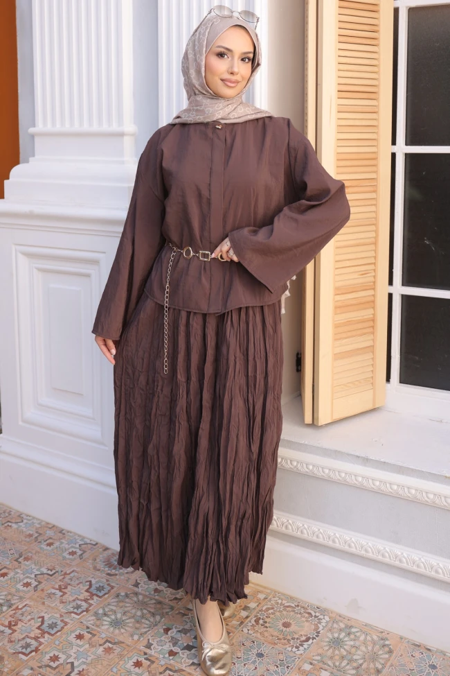 * Ürün Detay : Gömlek-etek takımı, modern tesettür modasının çok sevilen zahmetsiz şıklık çizgisini çok güzel yansıtıyor.Takımın en dikkat çekici özelliği kumaşındaki doğal kırışık doku. Gömleğin geniş kol detayı ve eteğin dökümlü yapısı, tesettür giyimde aranan o rahat ve hatları belli etmeyen silueti şık bir şekilde sunuyor. İnce, altın rengi zincir kemer harika bir dokunuş olmuş. Gömleği dışarıda bırakıp kemerle bel hattını hafifçe belirginleştirmek, boyu daha uzun ve silueti daha derli toplu gösterir.