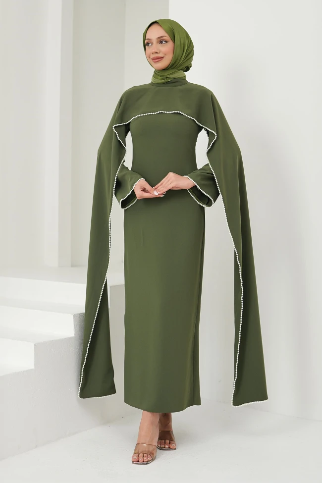 * Ürün Detay :Hem mütevazı hem de iddialı olmayı başaran, zamansız bir parça.Modern ve geleneksel çizgileri birleştiren, oldukça zarif bir tasarıma sahiptir.Göğüs hattı ve pelerin kenarları boyunca devam eden inci detayları, düz kumaşa ihtiyaç duyduğu ışıltıyı vermiştir.Tasarımın en güçlü yönü, omuzlardan başlayıp yere kadar uzanan pelerin formundaki kollardır.