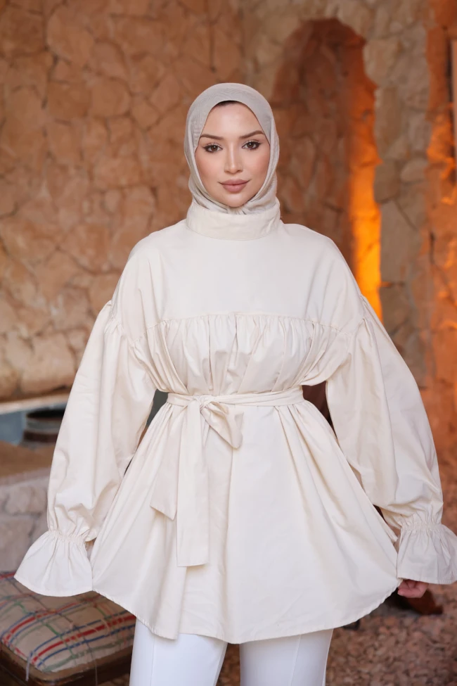 * Ürün Detay : Yeni sezon tunik modelimiz, modern detayları ve feminen dokunuşlarıyla hem şık hem de sofistike bir parça olarak öne çıkıyor.Tuniğin en dikkat çekici özelliği, dirseklerden itibaren genişleyen balon kolları ve bileklerdeki büzgülü volan detaylarıdır. Bu dramatik kol yapısı, parçaya avangart bir hava katıyor.Klasik yaka yerine tercih edilen dik yaka, tasarımı daha modern ve derli toplu bir görünüme kavuşturmuş.Göğüs hizasından başlayan hafif büzgü detayı, tuniğin alt kısmına doğal bir döküm ve hareket kazandırıyor.Kendi kumaşından olan bel kuşağı, oversize formu toparlayarak vücut hatlarını zarifçe ortaya çıkarıyor.