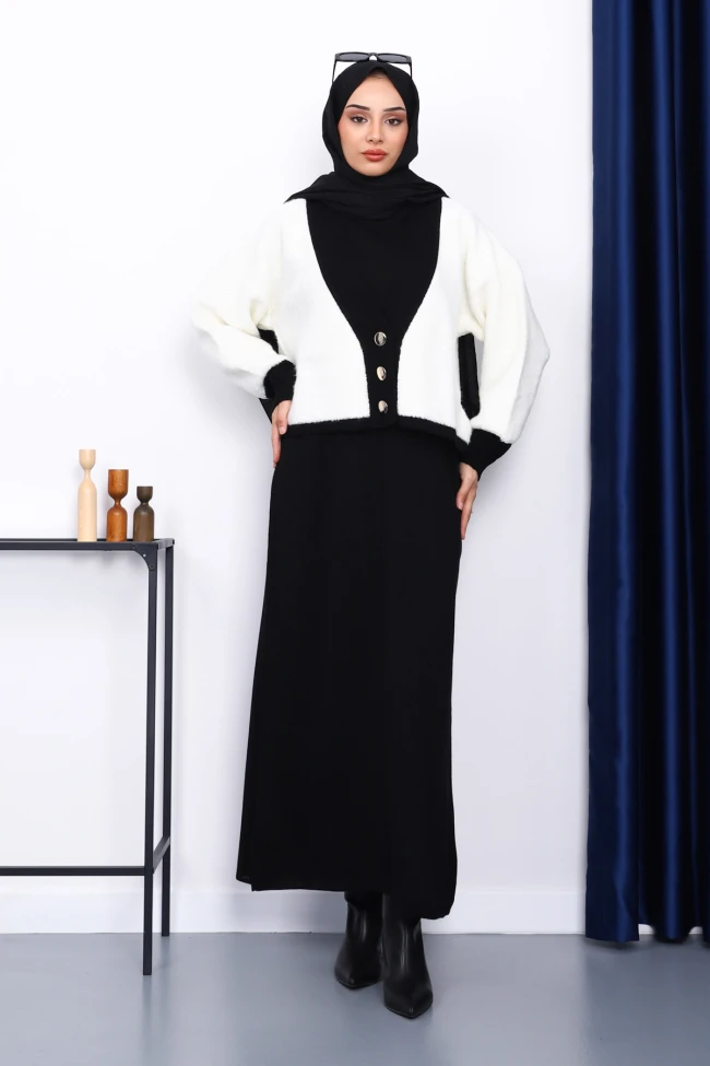 * Ürün Detay : Ürünümüz yeni sezona uygun Triko kumaştan üretilmiştir. Hırka ile Elbise ikili takım şeklindedir. Hırka ön düğmelidir.