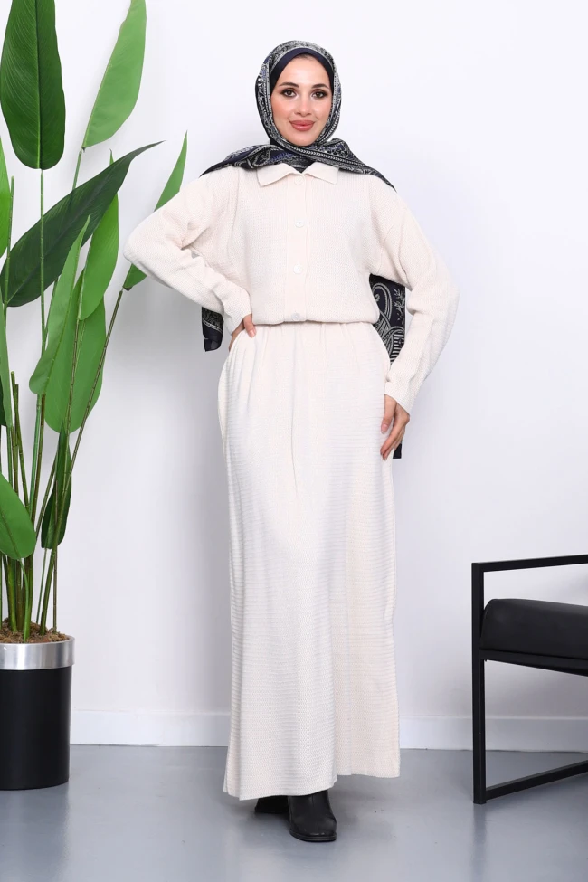 * Ürün Detay : Ürünümüz Triko kumaştan üretilmiştir. Hırka ve Etek ikili takım şeklindedir. Hırka ön kısmı düğmelidir. Etek bel kısmı lastiklidir.