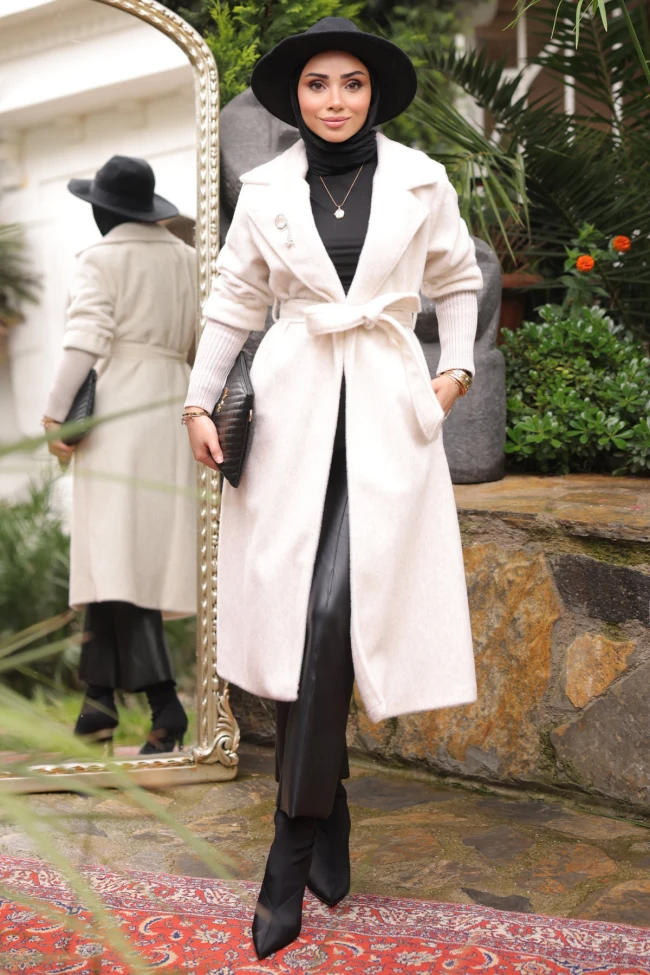 * Ürün Detay : Ürünümüz yeni sezona uygun Angora kumaştan üretilmiştir.  Bel kısmı kuşaklı olup, yan kısımları ceplidir. Yaka kısmı broş detaylıdır.