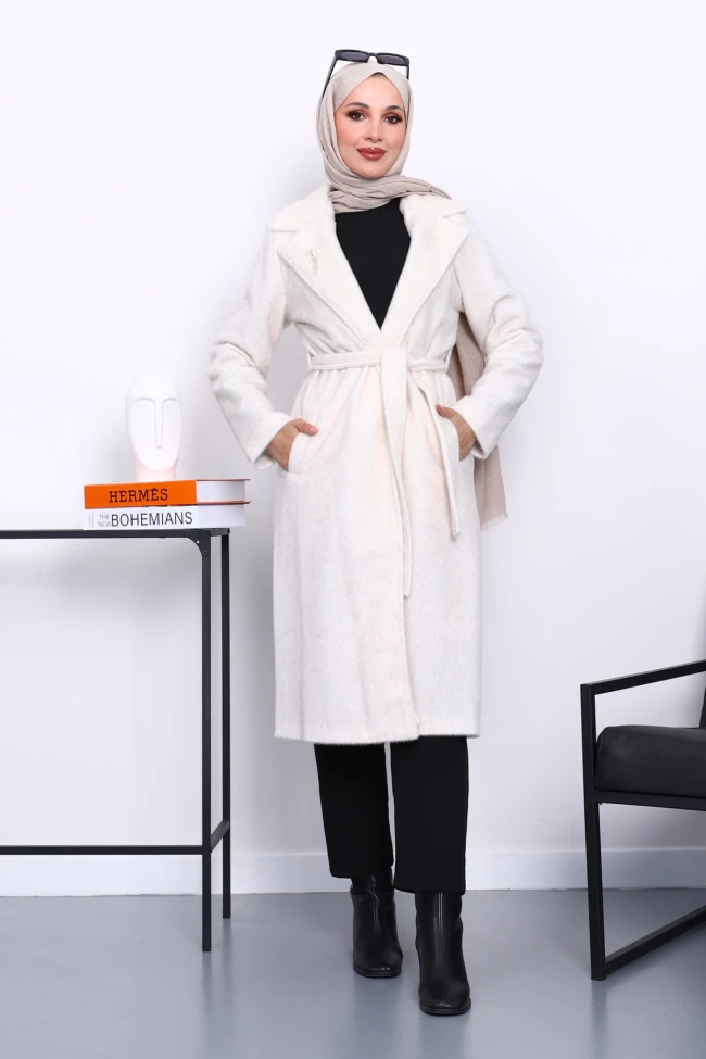 * Ürün Detay : Ürünümüz yeni sezona uygun Angora kumaştan üretilmiştir.  Bel kısmı kuşaklı olup, yan kısımları ceplidir. Yaka kısmı broş detaylıdır.