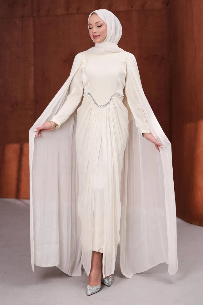 * Ürün Detay : Modern ve zarif detayların birleştiği, özellikle modest moda için oldukça şık bir tasarım.Pelerin ve etek kısmındaki dikey pileli şifon detaylar tasarıma hareket katıyor.Omuzlardan aşağı süzülen tül pelerinler, abiyeye bir hava katarken aynı zamanda vücut hatlarını yumuşatıyor.Bel ve boyun kısmındaki detaylar, abiyemize ekstra bir takı ihtiyacı bırakmayacak kadar zengin bir hava katmış. Beldeki kavisli işleme, vücudu daha uzun ve ince göstermek için stratejik bir dokunuş.Arka kısmın sadeliği, ön taraftaki yoğun plise ve taş detayını dengeliyor.