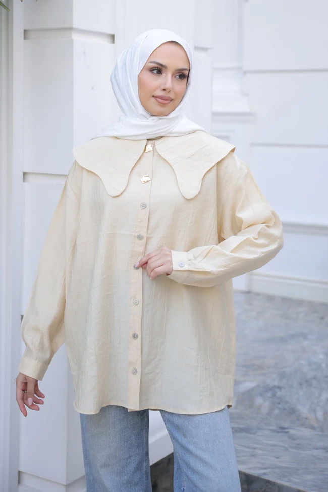 * Ürün Detay : Zarafeti ve konforu bir arada sunan bu özel tasarım tunik, gardırobunuzun en iddialı parçası olmaya aday! Vintage esintili oversize bebe yaka detayıyla dikkat çeken ürün, modern kesimiyle her ortama uyum sağlar.Geniş ve yuvarlak hatlı bebe yaka tasarımıyla stilinize feminen ve özgün bir dokunuş katar.Yakanın hemen altında bulunan gold metalik düğmeler, tuniğe lüks bir hava katarken geri kalan gizli düğme patı temiz bir görünüm sağlar.