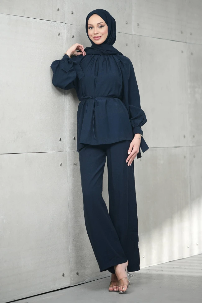 * Ürün Detay : Yeni sezon ikili takım, hem modern hem de oldukça zarif bir çizgiye sahip. Şıklığı konforla birleştirmek isteyenler için harika bir seçenek.Hakim yaka ve büzgü detayları, yüze daha toplu ve zarif bir ifade katıyor.Balon kol formundaki büzgüler ve bilekteki bağlama detayları takıma hareketli ve romantik bir hava katmış.Kendi kumaşından olan ince kuşak, silüeti belirginleştirerek salaş görünümün içinde vücut hatlarını dengeliyor.Bol paça kesimi, hem tesettür giyim standartlarına uygun bir konfor sunuyor hem de boyu daha uzun gösteren bir illüzyon yaratıyor.Tunik yan yırtmaçlıdır.