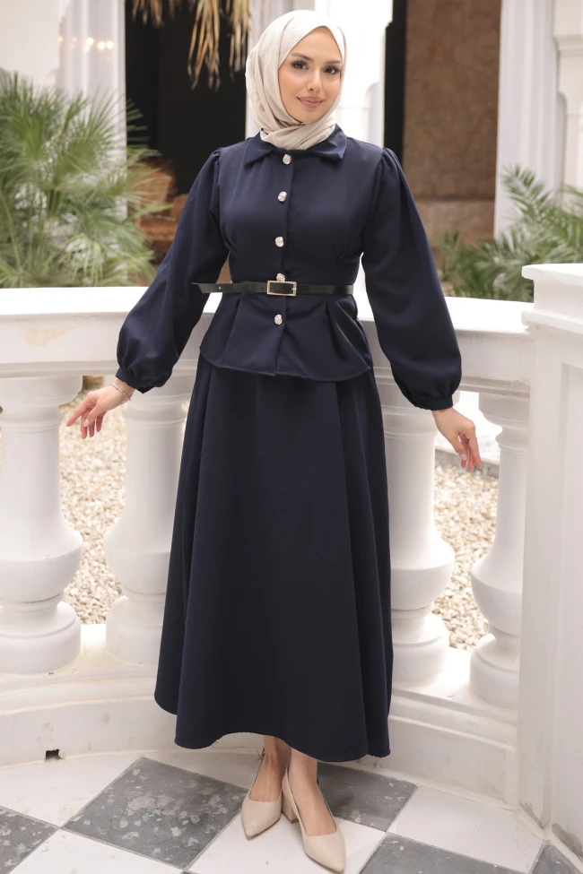 * Ürün Detay : Şık ve asil tasarım, özel günlerinizden günlük şıklığınıza kadar her anınıza eşlik edecek bir zarafet sunuyor.Bel kısmındaki zarif pens detayları ve peplum kesimi sayesinde vücut hatlarını naif bir şekilde vurgular. Ön kısmındaki kristal görünümlü düğmeler, takıma ışıltılı bir dokunuş katar.Bilekten lastikli balon kol tasarımı, hem konfor sağlar hem de romantik bir hava oluşturur.Yüksek bel, geniş kesim kloş eteği ile hareket özgürlüğü sunarken, asil duruşu tamamlar.Etek bel lastiklidir.Gömlek düğmeli ve kemerlidir.