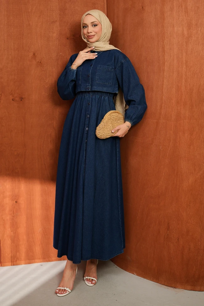 * Ürün Detay :Ceket ve elbise takımı, modest moda için oldukça güçlü ve dengeli bir görünüm sunuyor.Kısa ceket kesimi, bel hattını yukarı taşıyarak boyu daha uzun gösteren bir illüzyon oluşturuyor. Göğüs üzerindeki cep detayı, cekete klasik "jean ceket" karakterini verirken, elastik kol manşetleri modern bir dokunuş eklemiş.Beldeki büzgü detayı vücut hatlarını belli etmeden zarif bir silüet oluşturuyor. Boydan düğmeli olması ise hem kullanım kolaylığı sağlıyor hem de dikey bir hat oluşturarak ince bir görünüm destekliyor.Elbise bel lastiklidir.Kolsuzdur.