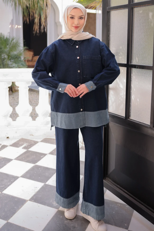 * Ürün Detay : Kot takımı, özellikle modest giyim tarzını benimseyenler için hem konforlu hem de oldukça modern bir seçenek sunuyor.Ceketin geniş kesimi ve pantolonun bol paça formu, gün boyu hareket özgürlüğü sağlarken vücut hatlarını belli etmeyen şık bir silüet oluşturuyor.Ceketin etek ucunda ve pantolonun paçalarında kullanılan daha açık tonlu denim şeritler, takıma hareket katmış. Bu detay, düz bir kot takımın monotonluğunu kırarak daha tasarım odaklı bir görünüm kazandırıyor.Metalik çıtçıt düğmeler, denim dokusuyla güzel bir kontrast oluşturarak spor-şık bir hava katmış.Pantolon bel lastikli cepli ve bel yüksek.