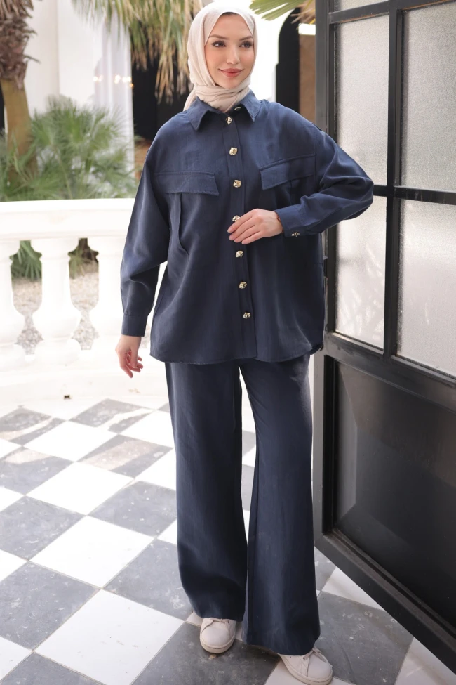 * Ürün Detay : Günlük şıklığınızı konforla buluşturan bu özel tasarım ikili takım, hem ofis stilinizde hem de hafta sonu etkinliklerinizde favori parçanız olmaya aday.Klasik gömlek yaka detayı, önden fonksiyonel altın sarısı düğmeleri ve göğüs kısmındaki kapaklı cep detaylarıyla şık bir denge kurar.Gün boyu hareket özgürlüğü sağlayan bol ve dökümlü kesim, modern tesettür giyim standartlarına tam uyum sağlar.Geniş paça tasarımıyla silüetinizi daha uzun ve zarif gösterir.Pantolon yüksek bel bel lastikli ve ceplidir.