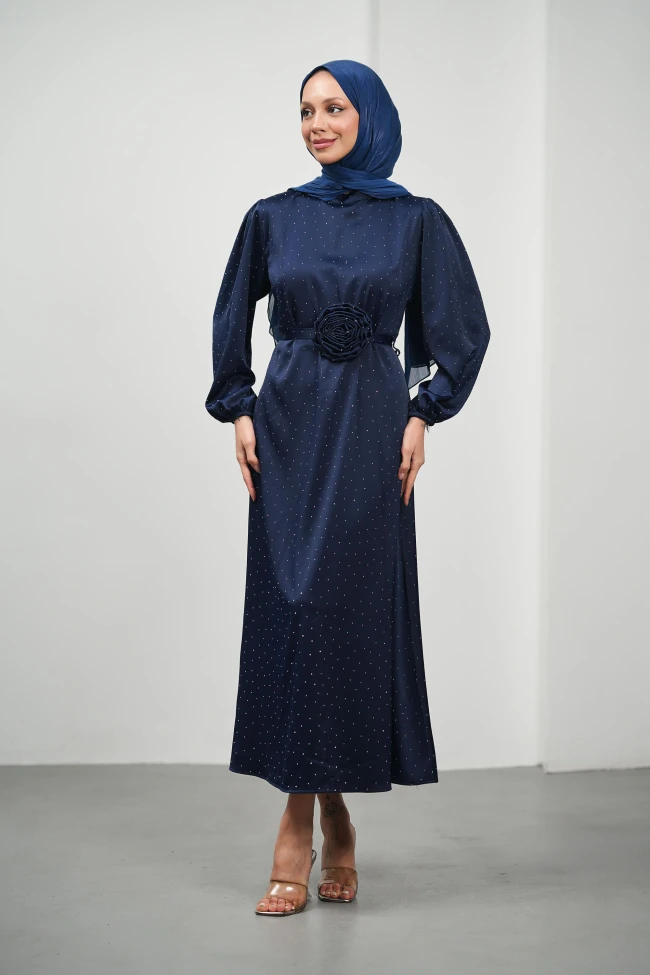 * Ürün Detay :Bel kısmındaki büyük gül detayı, elbisenin odak noktası. Bu tarz floral eklentiler sezonun trendleri arasında yer alıyor ve sade kesime hareket katıyor.Hafif balon kol detayı, muhafazakar moda standartlarına tam uyum sağlarken modern bir silüet çiziyor. Abiyemiz, hem zarafeti hem de modern detayları bir araya getiren oldukça şık bir tasarım.Kumaş üzerindeki ışıltı detayı, elbiseye gece davetleri için uygun, ışıltılı bir hava katmış.Kol manşetleri lastiklidir.Sırt fermuarlıdır.
