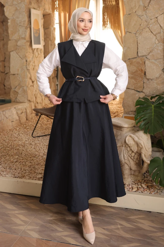 * Ürün Detay : Yelek-etek takımı, hem modern hem de klasik çizgileri birleştiren, oldukça zarif bir tesettür kombin örneği.Kruvaze yaka kesimi ve beldeki ince kemer detayı, takıma maskülen bir dokunuş katarken aynı zamanda feminen bir silüet oluşturuyor. Belin vurgulanması, alt kısımdaki volanlı yapıyla birleşince modern bir hava katmış.Yüksek bel ve çan kesim etek, hem konforlu bir hareket alanı sağlıyor hem de oldukça asil duruyor. Etek yan fermuarlı arka bel lastikli.Yelek astarlı.