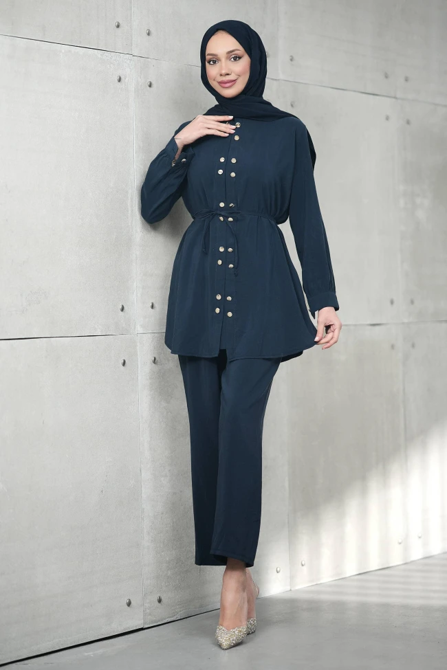 * Ürün Detay : "Hani o 'ne giysem?' dediğiniz anlar vardır ya... İşte o anların kurtarıcısı burada! Modern kesimi ve asil tonuyla bu takım, size hem çok iyi hissettirecek hem de çok şık gösterecek. İnce kuşak detayı çok yerinde bir dokunuş olmuş. Bol kesim bir takımı tek düze olmaktan kurtarıp, beli hafifçe vurgulayarak daha kadınsı ve düzenli bir silüet oluşturmuş.Ön kısımdaki çift sıralı metalik düğmeler takıma hoş bir esinti katıyor.