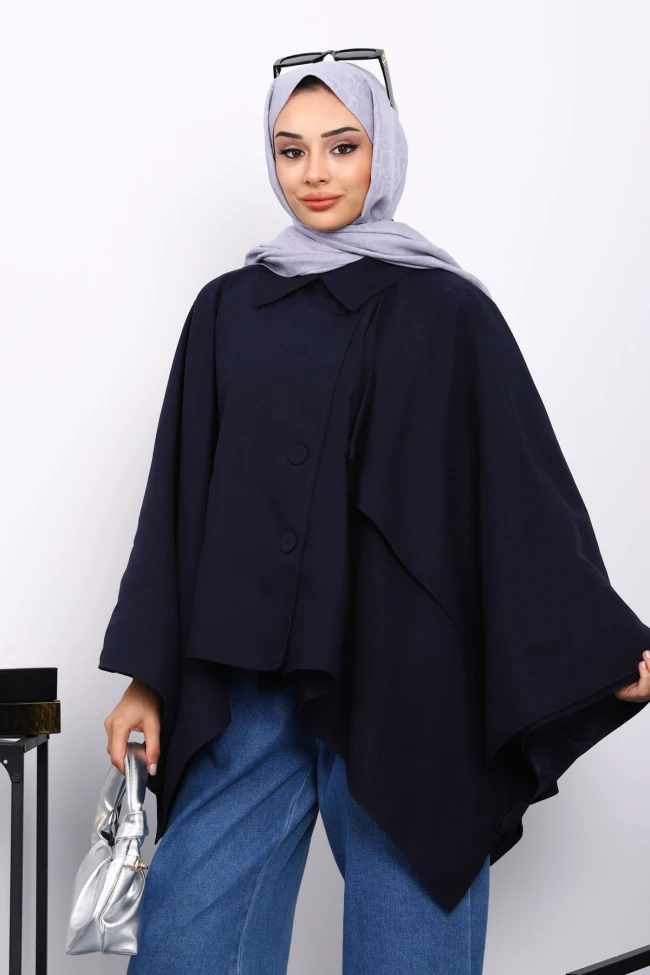 Bej Düğmeli Astarlı Panço Trençkot Siyah Düğmeli Astarlı Panço Trençkot