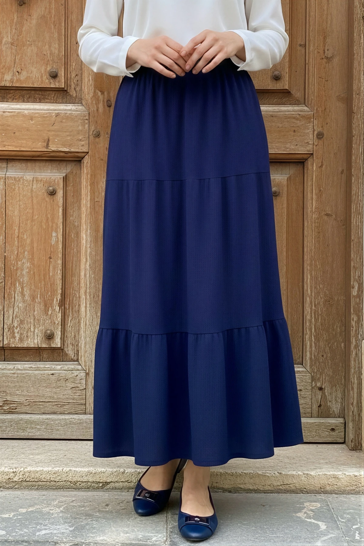 * Ürün Detay : Etek, hem konforu hem de zamansız şıklığı bir araya getiren çok yönlü bir parça. Bürümcük kumaşın kendine has dokusu, eteğe hem modern bir hava katıyor hem de kullanım kolaylığı sağlıyor.Ütü istemeyen yapısıyla kurtarıcı bir parçadır. Seyahatlerde veya yoğun günlerde kırışıklık derdi olmadan kullanılabilir.Eteğin üç katlı yapısı, modele hareket ve hacim kazandırmış. Bu kesim, silüeti daha akıcı gösterirken aynı zamanda bohem ve zarif bir duruş sergiliyor.Lastikli bel yapısı, gün boyu rahatlık sunar ve farklı beden ölçülerine kolayca uyum sağlar.