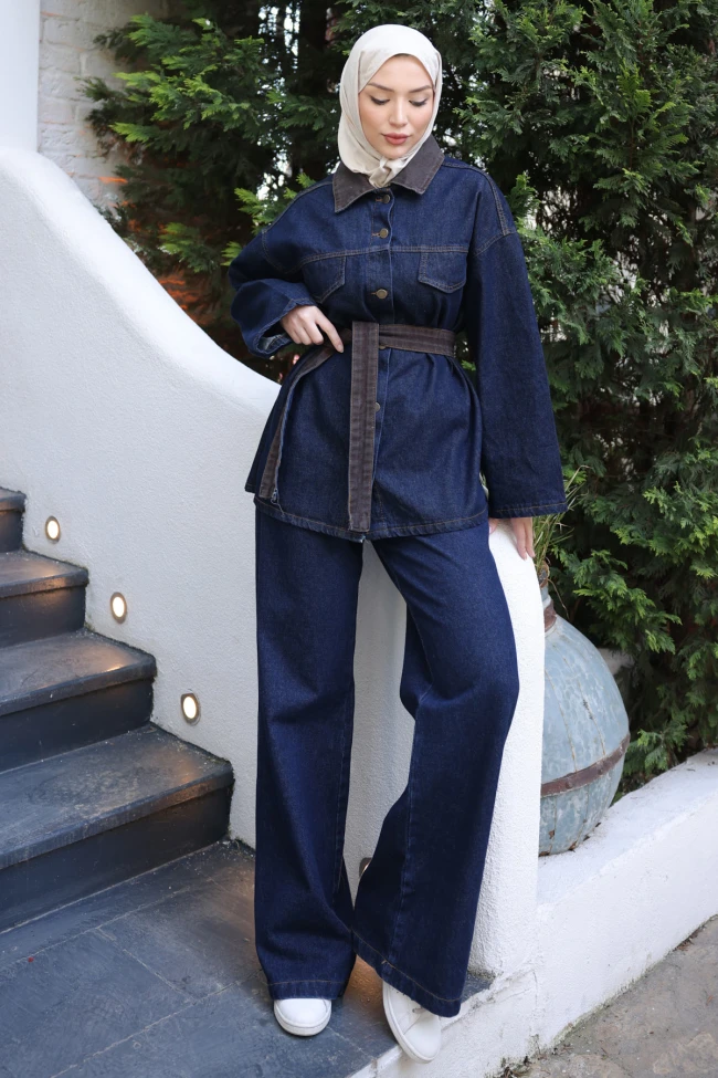 * Ürün Detay : Takım, modern kesimlerle geleneksel modest giyimi çok şık bir şekilde harmanlamış. Hem günlük konforu hem de güçlü bir stili aynı anda sunuyor.Ceketin geniş kolları ve dökümlü yapısı, "çabasız şıklık" dediğimiz o modern havayı yakalamış. Pantolonun bol paça kesimiyle birleşince uzun ve dengeli bir silüet oluşturmuş.Takımın en can alıcı noktası kuşağı. Geniş kesimli parçalarda vücut hatlarının kaybolmaması için beli vurgulamak çok akıllıca bir dokunuş. Bu, kıyafete form kazandırarak daha feminen bir hava katıyor.Yaka ve kuşaktaki farklı renk görünümlü detaylar, tek düze bir kot görüntüsünü kırmış.Pantolon yüksek bel bel lastikli ve ceplidir.