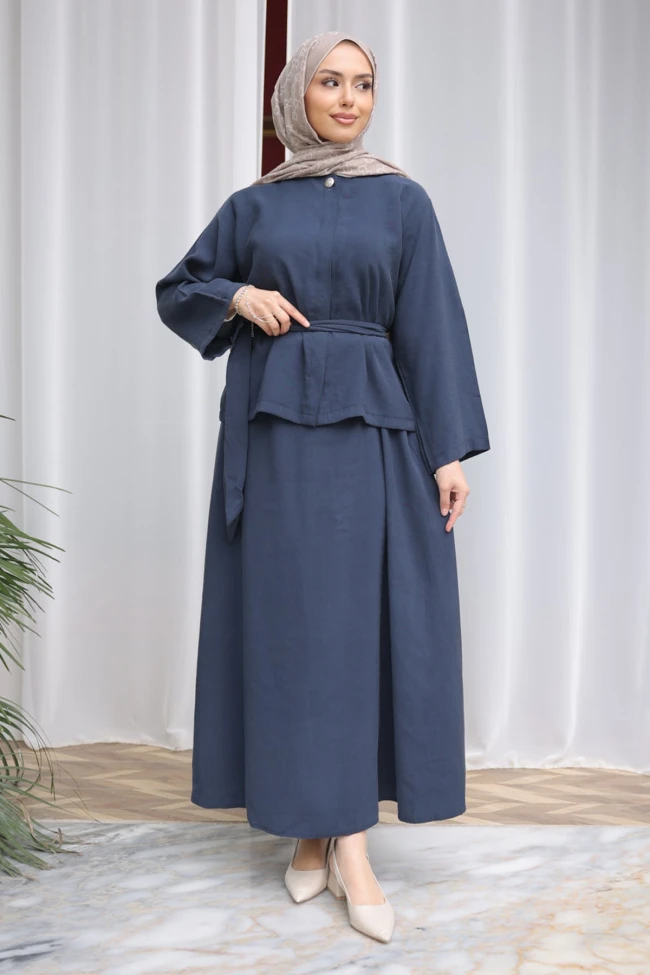 * Ürün Detay : Takım, hem sofistike duruşu hem de sağladığı konforla modest giyimin en güçlü örneklerinden biri olmuş.Gömlek formundaki üst parça, beldeki kuşak detayı sayesinde vücut formunu zarifçe ortaya çıkarıyor. Hakim yaka ve tek düğme detayı, ürüne minimalist ve asil bir hava katmış. Geniş kesim kolları ise tesettür giyimde aranan rahatlığı sağlıyor.A-kesim, dökümlü uzun etek; üst parça ile mükemmel bir bütünlük içersinde.