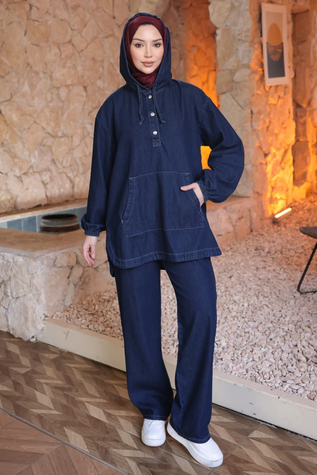 Mavi Kapşonlu Kol Lastikli Tunik Pantolonlu Kot Takım