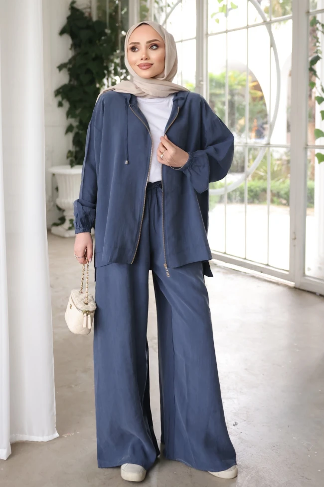 * Ürün Detay : Takım, modest giyimin en başarılı örneklerinden biri; hem konforlu hem de oldukça sofistike bir duruş sergiliyor.Kombinin en güçlü yanı oversize ve dökümlü yapısı. Geniş paça pantolon ile kapüşonlu ceketin salaşlığı, modern bir hava oluşturmuştur. Ceketin bel boyu, geniş paçalı pantolonun hacmini dengeleyerek silüeti boğmamış.Pantolon bel lastikli ve ceplidir.