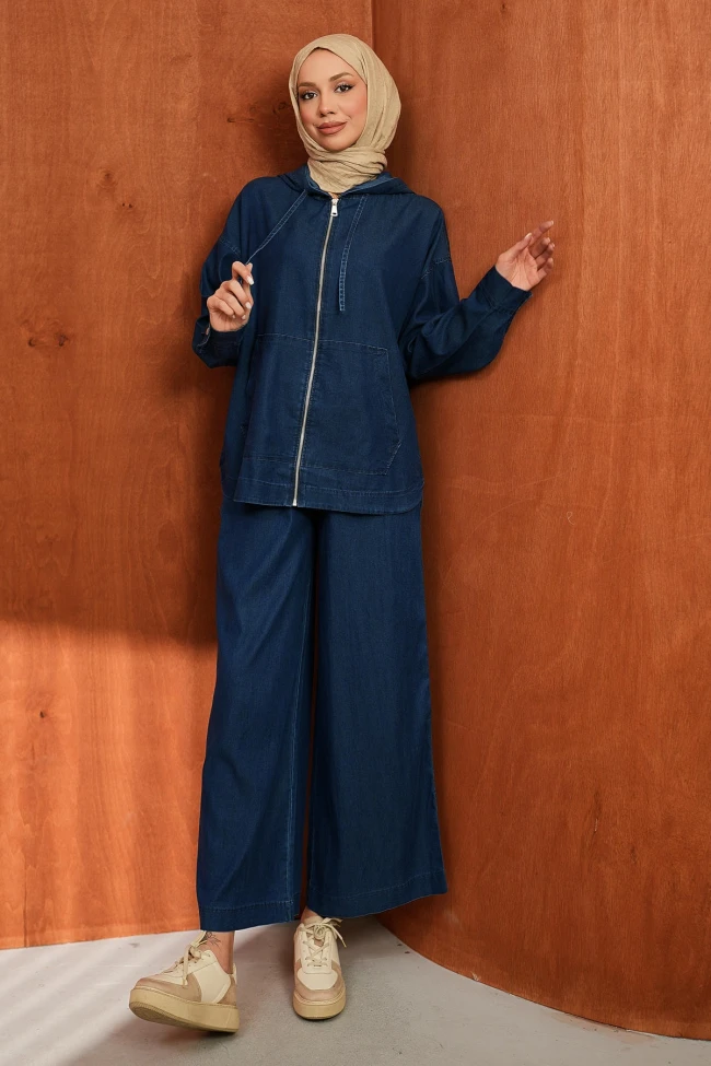 * Ürün Detay : Kot takımı, hem konforu hem de modest giyim tarzını çok şık bir şekilde birleştirmiş.Fermuarlı ve kapüşonlu bir "denim ceket-tunik" formunda. Kanguru cep detayı sportif bir hava katarken, boyunun uzunluğu tesettür giyim için büyük bir avantaj sağlıyor.Geniş paça pantolon, son dönemlerin en büyük trendlerinden biri. Hem hareket özgürlüğü sunuyor hem de vücut hatlarını belli etmeyen zarif bir silüet oluşturuyor.Pantolon cepli yüksek bel ve bel lastikli.