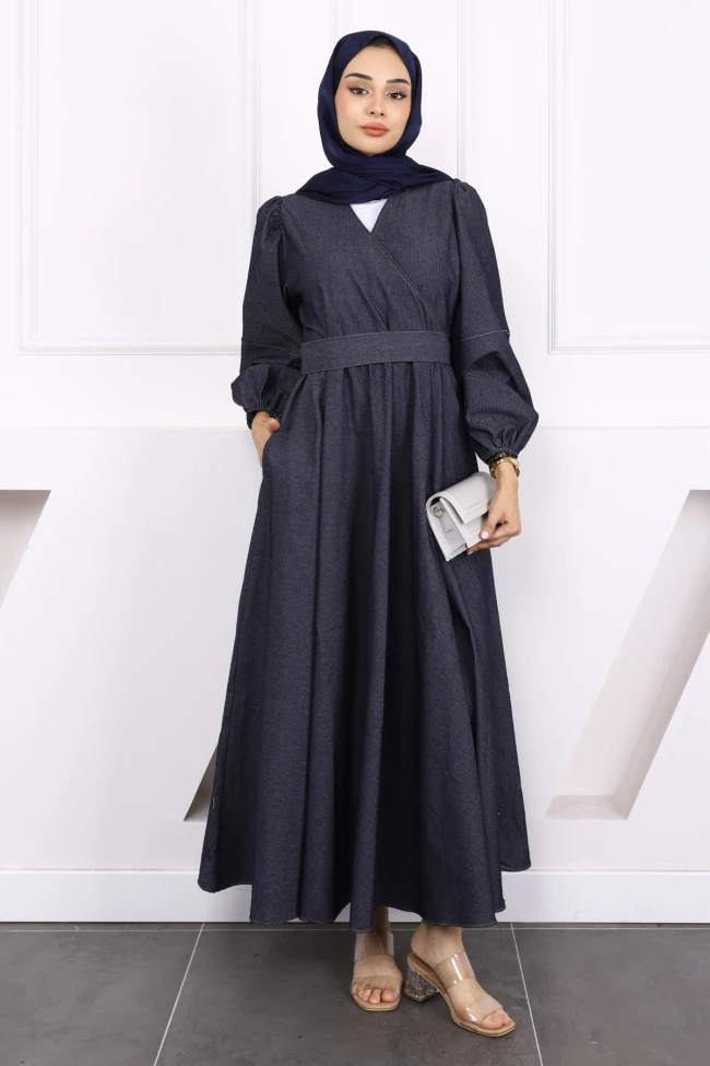 Koyu Mavi Kruvaze Yaka Bel Kuşaklı Kot Elbise