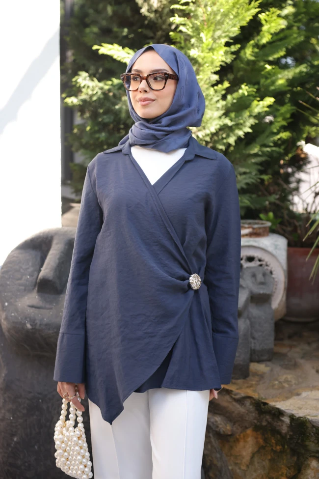 * Ürün Detay : Gömlek, "sessiz lüks" akımına göz kırpan, zamansız bir yatırım parçası gibi duruyor.Gömlek, klasik tunik anlayışını modern ve sofistike bir dokunuşla yeniden yorumlayan, oldukça asil bir parça.Gömleğin en belirgin özelliği, öndeki kruvaze geçiş ve bu geçişin oluşturduğu doğal drapeler. Bu asimetrik duruş, vücut hatlarını yumuşatarak oldukça zarif bir silüet çiziyor.Bel kısmındaki ışıltılı büyük broş, tasarıma lüks bir hava katmış. Bu detay, gömleği sadece günlük bir parça olmaktan çıkarıp akşam yemekleri veya özel davetler için de uygun hale getiriyor.Geniş ve belirgin manşetler, gömleğin maskülen gömlek yapısını korurken, derin V yaka kesimi modern bir tesettür stiline uyarlanmış.Bel düğmelidir.