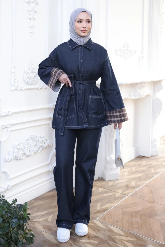 * Ürün Detay : Kot takım, hem spor hem de modern bir şıklığı bir araya getiren oldukça dikkat çekici bir tasarım.Koyu renk denim üzerindeki açık renk kontrast dikişler, takıma mimari bir yapı kazandırmış ve ürünün kalitesini ön plana çıkarmış.Kolların manşet kısmındaki ekose detayı, takımı klasik bir denim setten ayırarak daha özgün bir moda parçasına dönüştürüyor.Beldeki kuşak hem silüeti topluyor hem de cekete daha feminen bir hava katıyor. Geniş yama cepler ise sezonun işlevsel modasına göz kırpıyor.Pantolonun geniş ve dökümlü kesimi, günümüzün "oversize" ve konfor odaklı giyim trendlerine tam olarak hitap ediyor.