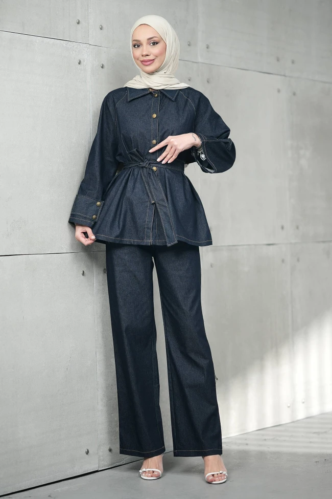 * Ürün Detay : Kot takım, hem modern hem de mütevazı giyim tarzını çok şık bir şekilde birleştirmiş.Beldeki kuşak detayı, silüeti belirginleştirerek feminen bir hava katmış. Geniş manşetler ve metal düğmeler, klasik kot ceket havasını daha sofistike bir "ceket-tunik" formuna taşımış.Bol paça kesim, hem rahatlık sunuyor hem de üzerindeki daha hareketli ceketle dengeli bir görünüm oluşturuyor. Boyu ve dökümü oldukça yerinde duruyor.Pantolon yüksek bel,bel lastikli ve ceplidir.