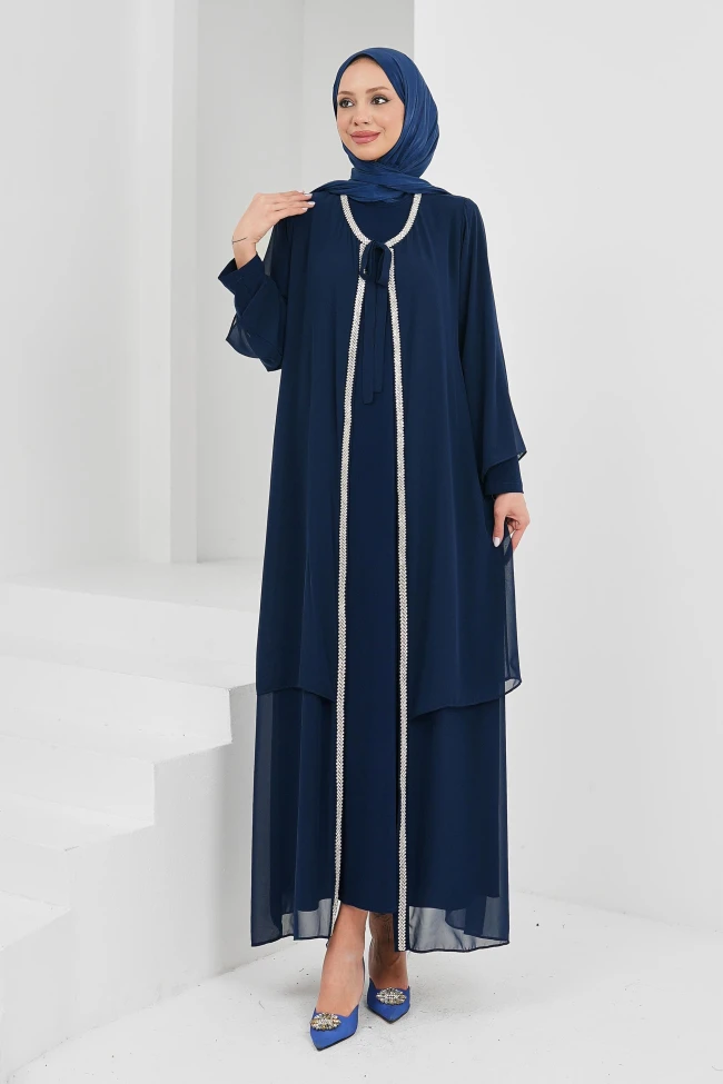 * Ürün Detay : Abaya takımı, minimalizm ile zarafeti birleştiren, özellikle konfor ve şıklığı aynı anda arayanlar için ideal bir parça.Takımın iç elbise ve üzerindeki şifon detaylı pelerinden oluşması, modele hareketli ve akışkan bir form kazandırmış.Boydan boya inen taşlı şeritler, abayanın ağırlığını kırarak tasarıma aydınlık bir hava katıyor. Bu dikey şeritler aynı zamanda silüeti daha ince ve uzun gösterme etkisine sahip.Yakadaki fiyonk detayı, tasarıma romantik ve zarif bir dokunuş ekleyerek bütünlüğü tamamlıyor.Şifonun hafifliği ve transparan katmanları, abayanın "ağır" bir kıyafetten ziyade, modern ve uçuş uçuş bir görünüme kavuşmasını sağlamış.Bu takım, abartıdan uzak ama detaylarıyla "kalite" sinyalleri veren bir model.