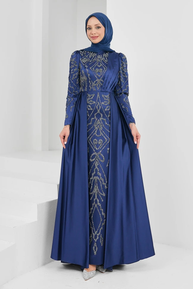 * Ürün Detay :Abiye, hem geleneksel motifleri hem de modern terzilik detaylarını barındıran oldukça görkemli bir tasarım.Elbisenin üzerindeki gümüş renkli işlemeler, saraylı bir hava katıyor. Özellikle gövdeden aşağıya doğru dikey bir hat çizen motifler, boyu daha uzun ve silüeti daha ince gösterme avantajına sahip.Omuzdan göğüs kısmına doğru inen saten pile detayı, klasik işlemeli görünümü kırarak elbiseye modern ve tasarımcı işi bir hava katmış.Belden yanlara doğru açılan pelerin tarzı ek kumaş parçaları, modele hacim ve ihtişam kazandırıyor. Bu yapı, özellikle fotoğraf çekimlerinde dramatik bir duruş sergilemek için ideal.