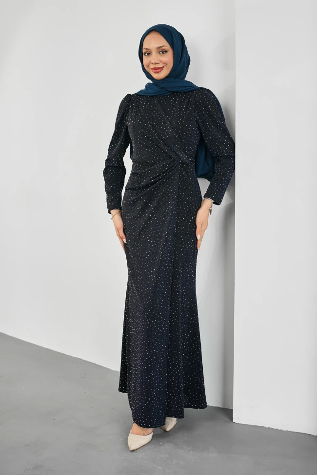 Siyah Simli Taşlı Önü Drapeli Abiye