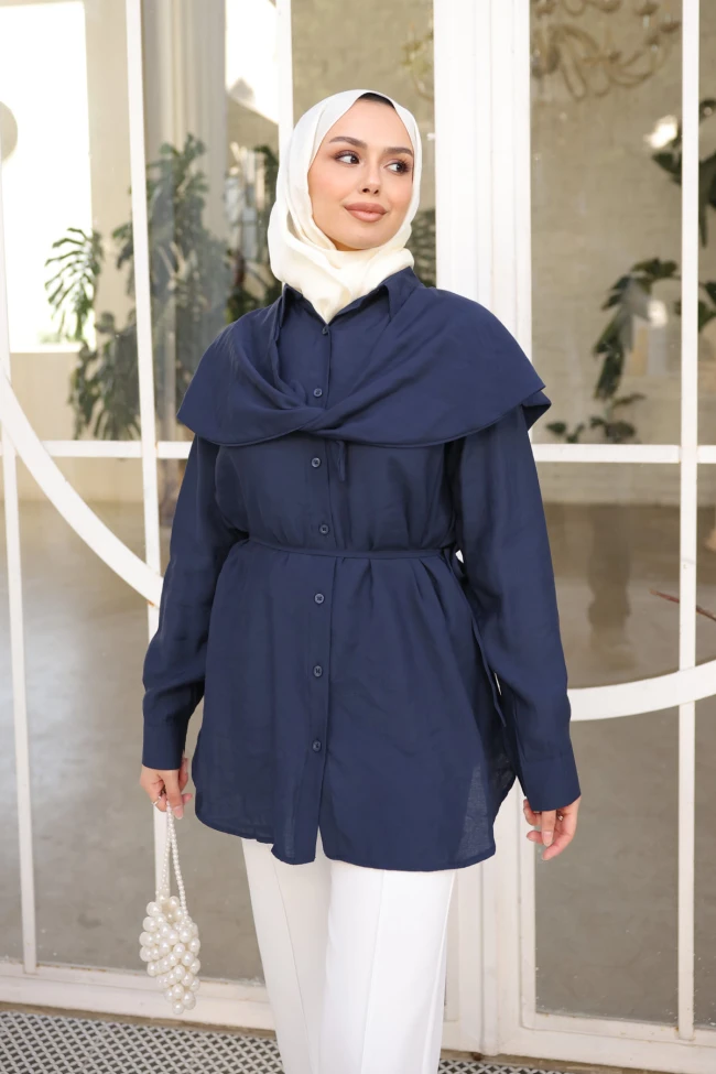 * Ürün Detay : Gömlek, özellikle minimalist şıklık ve modern detayları bir araya getiren yapısıyla dikkat çekiyor. Klasik gömlek formuna eklenen özgün dokunuşlar, parçayı sıradanlıktan çıkarıp bir tasarım ürünü haline getirmiş.Omuzlardan göğüs hizasına kadar inen geniş, dikişsiz görünümlü yaka detayı parçaya mimari bir derinlik katıyor. Bu kesim, üst bedeni daha hareketli ve modern gösteriyor.Kendi kumaşından olan ince kuşak, gömleğin volanlı alt kısmıyla birleşerek çok zarif görünüm sunuyor.