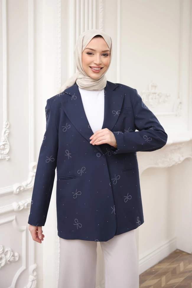 * Ürün Detay : Fiyonk taş işlemeleriyle parlayan, zarif bir tasarım.ceket, klasik blazer formunu ışıltılı ve romantik detaylarla birleştiren, oldukça zarif bir parça.Ceket, modern bir oversize (geniş kesim) kalıba sahip. Boyunun uzunluğu, özellikle tesettür giyimde aranan o ölçülü ve şık duruşu sağlıyor.Ceketin her yerine serpiştirilmiş küçük fiyonk şeklindeki taş işlemeler, tasarıma romantik ve feminen bir hava katmış. Bu detay, ceketi günlük bir parçadan çıkarıp özel davetlerde de giyilebilecek bir "star parça" haline getiriyor.Astarlıdır.