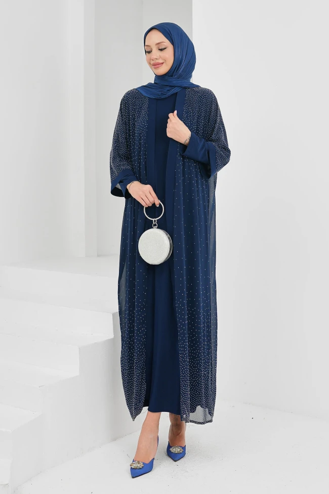 * Ürün Detay : Abaya takımı, ışıltıyı sadelikle buluşturan, oldukça modern ve asil bir tasarım.Üzerindeki minik taş işlemeleri, adeta bir gece gökyüzünü andırıyor. Bu serpme ışıltılar, düz bir abayayı anında "abiye" kategorisine taşıyarak özel davetler için uygun hale getirmiş.İçteki düz elbise ve dıştaki şeffaf şifon pelerin birlikteliği, tasarıma hem derinlik hem de uçuş uçuş, hafif bir hava katıyor.Bol ve dökümlü kesimi sayesinde hem konforlu bir kullanım sunuyor hem de tesettür giyim standartlarını çok şık bir şekilde karşılıyor.