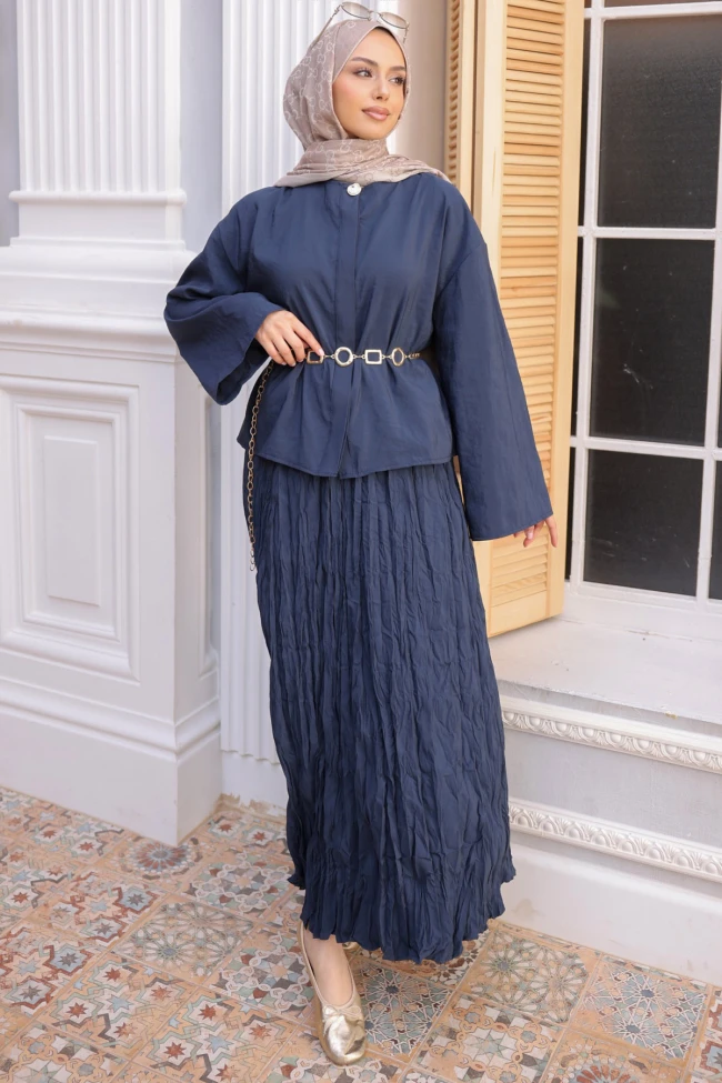 * Ürün Detay : Gömlek-etek takımı, modern tesettür modasının çok sevilen zahmetsiz şıklık çizgisini çok güzel yansıtıyor.Takımın en dikkat çekici özelliği kumaşındaki doğal kırışık doku. Gömleğin geniş kol detayı ve eteğin dökümlü yapısı, tesettür giyimde aranan o rahat ve hatları belli etmeyen silueti şık bir şekilde sunuyor. İnce, altın rengi zincir kemer harika bir dokunuş olmuş. Gömleği dışarıda bırakıp kemerle bel hattını hafifçe belirginleştirmek, boyu daha uzun ve silueti daha derli toplu gösterir.