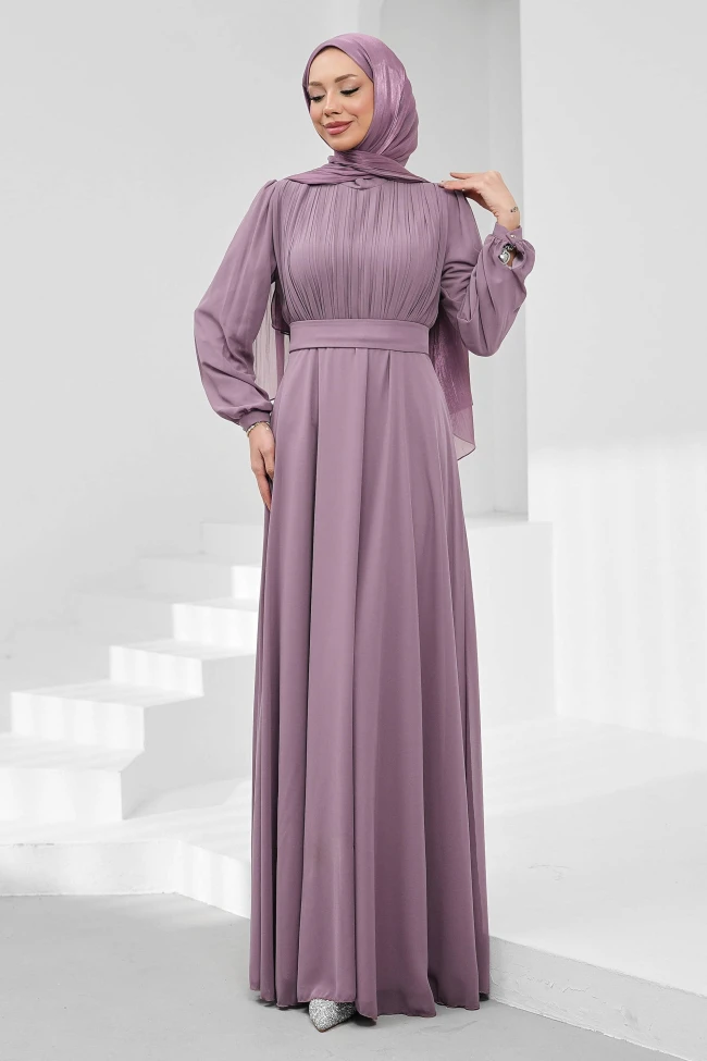 * Ürün Detay : Abiye, zarafeti ve modest çizgiyi çok dengeli bir şekilde birleştirmiş. Kesimiyle oldukça huzurlu ve asil bir duruş sergiliyor.Göğüs kısmındaki ince dikey plise detayları, elbiseye hareket ve derinlik katmış. Bu dikey çizgiler her zaman daha uzun ve ince görünmenize yardımcı olur.Kendi kumaşından yapılan kalın bel kuşağı, vücut hatlarını zarifçe ayırarak silüeti topluyor. Yüksek bel kesimi, bacak boyunu daha uzun göstermek için stratejik bir dokunuş olmuş.Balon kol formundaki kollar, bileklerdeki manşetlerle birleşerek hem rahatlık sağlıyor hem de eforsuz bir şıklık sunuyor. Şifon kumaşın dökümü kollarda çok yumuşak durmuş.