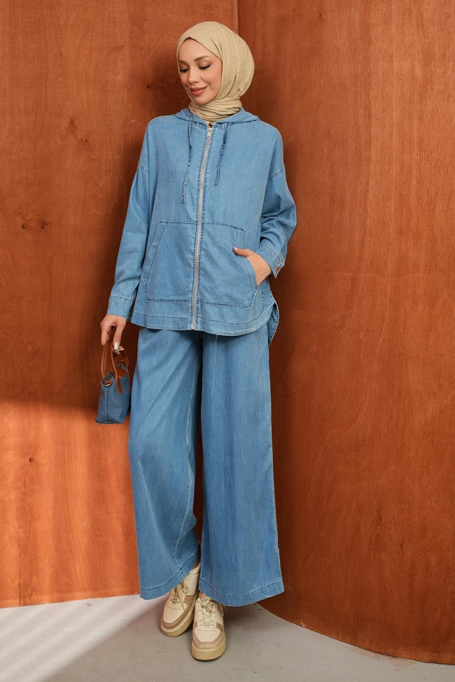 * Ürün Detay : Kot takımı, hem konforu hem de modest giyim tarzını çok şık bir şekilde birleştirmiş.Fermuarlı ve kapüşonlu bir "denim ceket-tunik" formunda. Kanguru cep detayı sportif bir hava katarken, boyunun uzunluğu tesettür giyim için büyük bir avantaj sağlıyor.Geniş paça pantolon, son dönemlerin en büyük trendlerinden biri. Hem hareket özgürlüğü sunuyor hem de vücut hatlarını belli etmeyen zarif bir silüet oluşturuyor.Pantolon cepli yüksek bel ve bel lastikli.